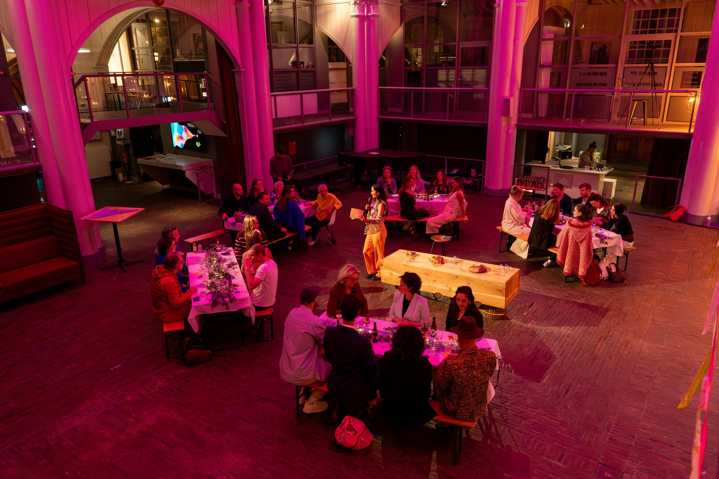 Een diner over de dood bij Midwest in Amsterdam. Deelnemers kwamen in duo’s, brachten een gerecht mee dat hun relatie symboliseert en kwamen in de outfit aan die zij op hun laatste feestje zouden willen dragen.